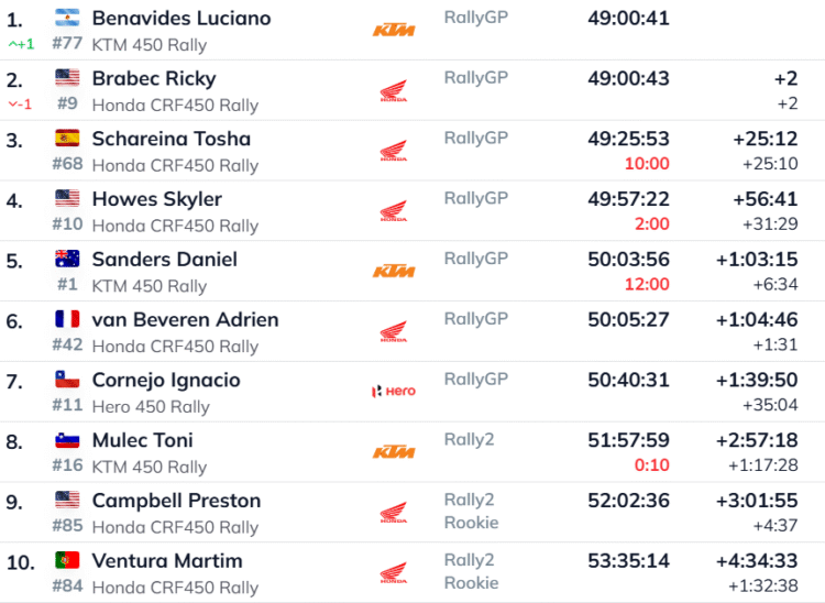 Vaid seitse kilomeetrit enne ralli lõppu tegi Brabec harvaesineva navigatsioonivee. See eksimus maksis talle väärtuslikke minuteid ning langetas ta etapi kokkuvõttes üheksandaks. Benavides kasutas ootamatu võimaluse koheselt ära – ta lõpetas katse teisena ning tõusis üldarvestuses vaid kahesekundilise eduga Brabeci ette.