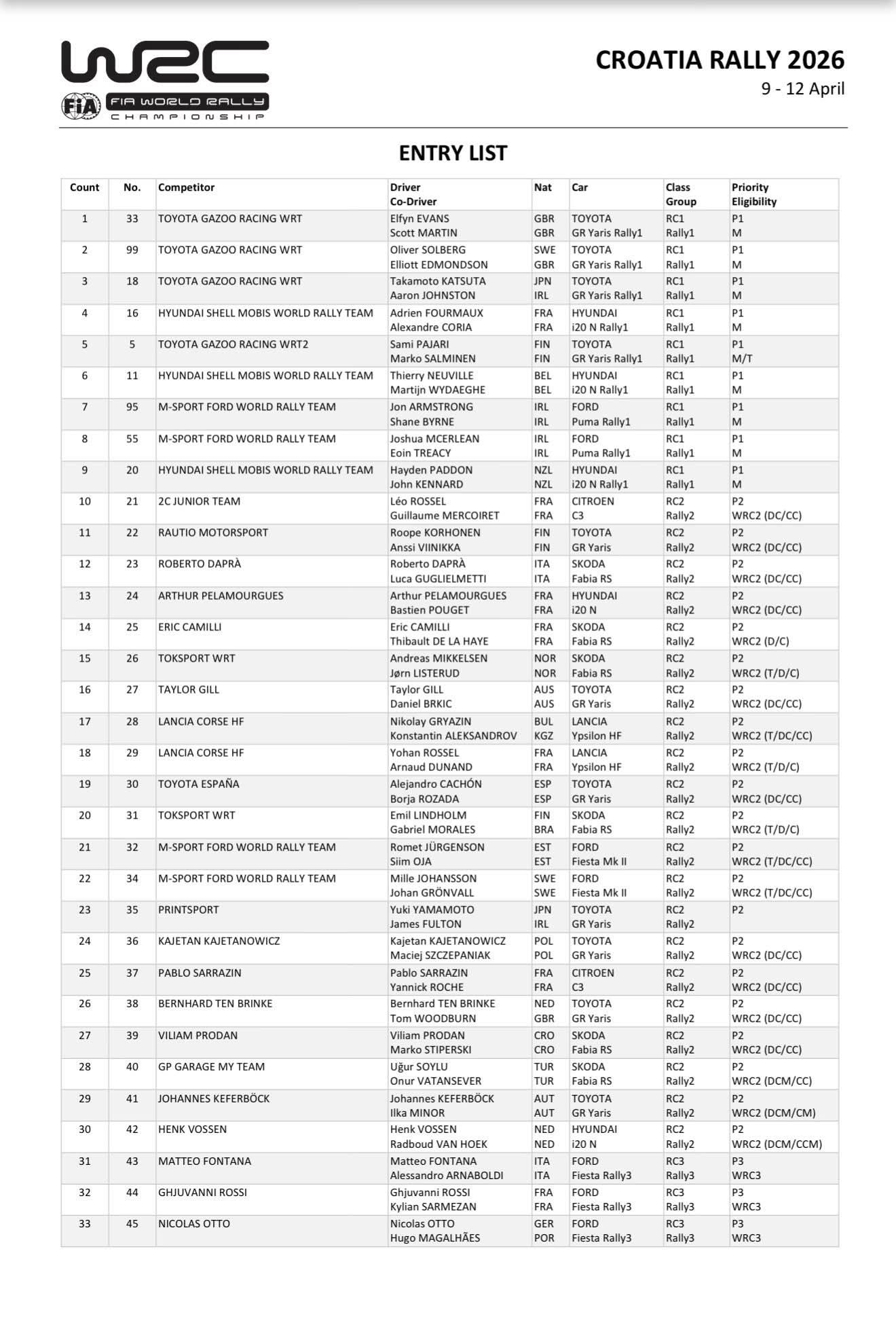 Hyundai Motorsport usaldab täpselt sama rivistust mis hooaja esimesel etapil Monte Carlos – rooli istuvad Thierry Neuville, Adrien Fourmaux ja Hayden Paddon. M-Sport Fordi Ford Pumaga on stardis Jon Armstrong ja Joshua McErlean.