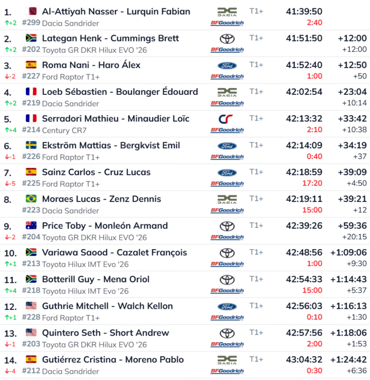 Päeva suurim võitja oli kahtlemata Nasser Al-Attiyah. Kuigi ta sai väikese karistuse kiiruse ületamise eest, on ta nüüd kindlalt teel oma kuuenda Dakari tiitli poole. Tema edumaa Toyota piloodi Henk Lategani ees on kasvanud 12 minutile, mis annab talle enne viimaseid etappe arvestatava puhvri.