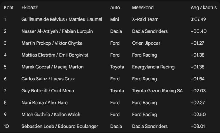 Suurematest nimedest lõpetas Carlos Sainz seenior päeva kuuendana (+1.54) ja Sebastien Loeb kümnendana, kaotades võitjale veidi üle kolme minuti.