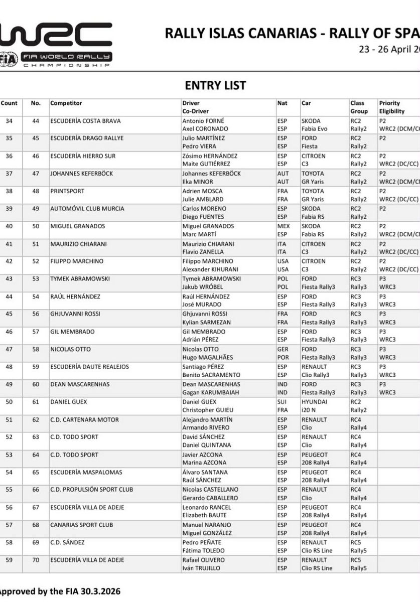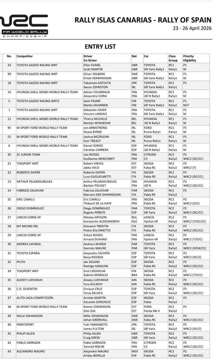 Hyundai Motorspordi kolmandat i20 N Rally1 autot rooliva Sordo naasmine oli õhus alates eelmise aasta lõpust, mil meeskond avalikustas 2026. aasta strateegia. Nüüd kinnitab avaldatud stardinimekiri, et 23.–26. aprillini sõidetav, 18 kiiruskatset ja 322,21 kilomeetrit hõlmav Gran Canaria etapp tähistab kogenud hispaanlase ametlikku tagasitulekut. Sordo viimane osalemine Rally1 masinaga jääb 2024. aasta Kreeka Akropolise rallisse, mille ta lõpetas kõrge teise kohaga.