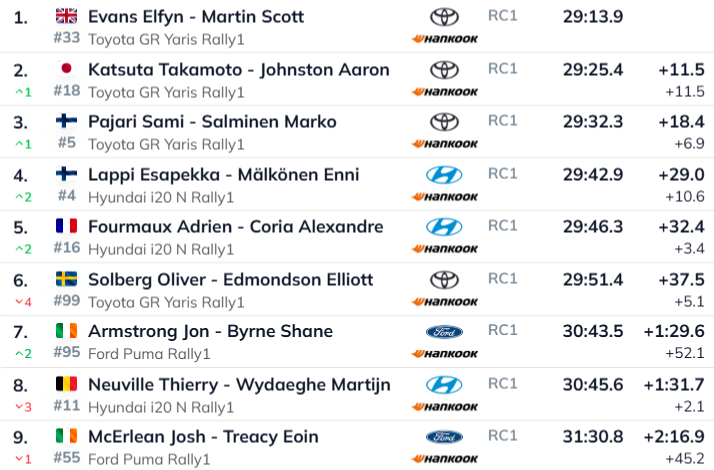Päeva teisel katsel teelt väljas käinud Oliver Solberg kaotas selle tõttu katse võitnud ralli liidrile Elfyn Evansile üle poole minuti.
