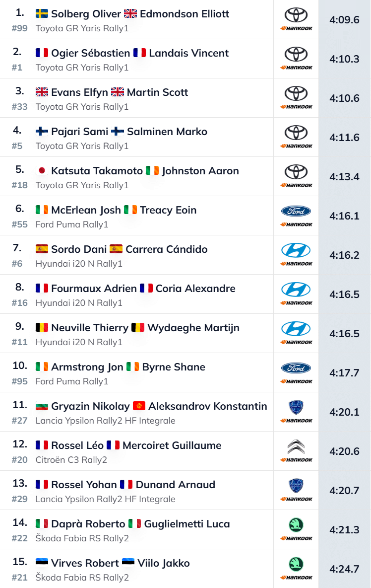 Parim mitte-Toyota oli kuuenda aja välja sõitnud Josh McErlean (M-Sport Ford), kes jäi Solbergile alla 6,5 sekundiga. “Rütmi leidmine on väga oluline. Katsed on siin imelised ja rahvast on palju. Ootan väga nädalavahetust,” sõnas McErlean.