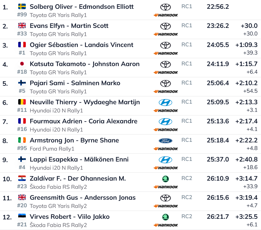 Solberg edestas Evansit tervelt poole minutiga, kusjuures rootslase keskmine kiirus jäi keeruliste olude tõttu kõigest 63,7 kilomeetri juurde tunnis. Kokkuvõttes haaras Toyota esimese katse järel absoluutse domineerimise, hoides esiviisikut: Solbergile ja Evansile järgnevad ligikaudu minutilise kaotusega Sebastien Ogier ning Takamoto Katsuta, viiendat positsiooni hoiab enam kui kaheminutilise kaotusega Sami Pajari.