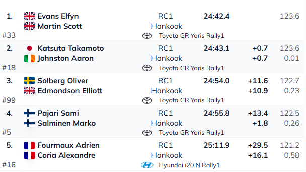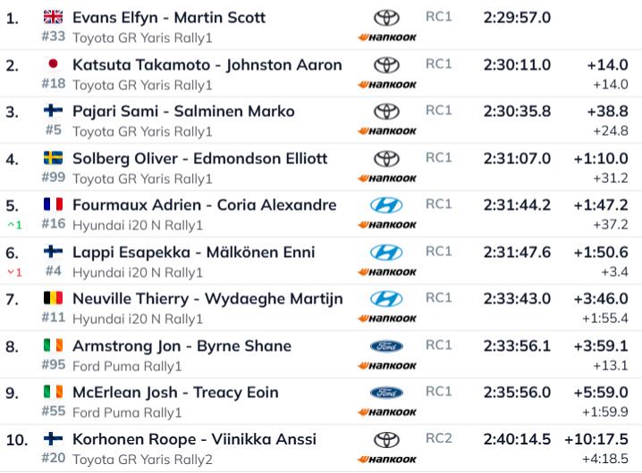 Esikümne teises pooles järgnevad Toyotadele Hyundai piloodid Fourmaux, Lappi ja Thierry Neuville. Neile pakuvad konkurentsi M-Sport Fordi sõitjad Jon Armstrong ning Josh McErlean.