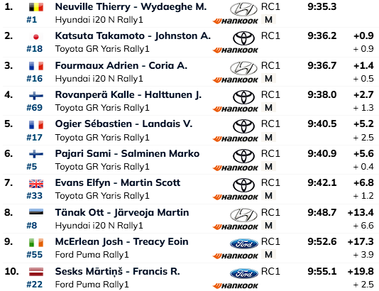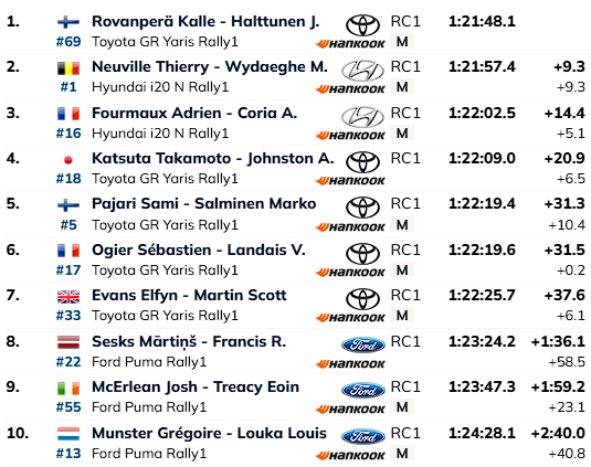 Päeva kolmanda kiiruskatse võitis Thierry Neuville. Ralli liider Kalle Rovanperä lõhkus katse lõpuosas parema tagumise rehvi, mistõttu kaotas pisut aega. Õnneks juhtus intsident üsna lõpus ning kaotust jäi minimaalselt — Neuville’ile jäi ta alla vaid 2,9 sekundiga.