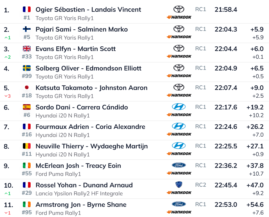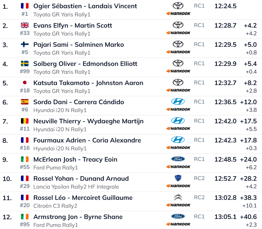 Hyundai leeris on olukord aga märksa murelikum. Dani Sordo oli küll Hyundai triost selgelt kiireim, kaotades Ogier’le 12 sekundiga, kuid Thierry Neuville ja Adrien Fourmaux jäid veelgi kaugemale.