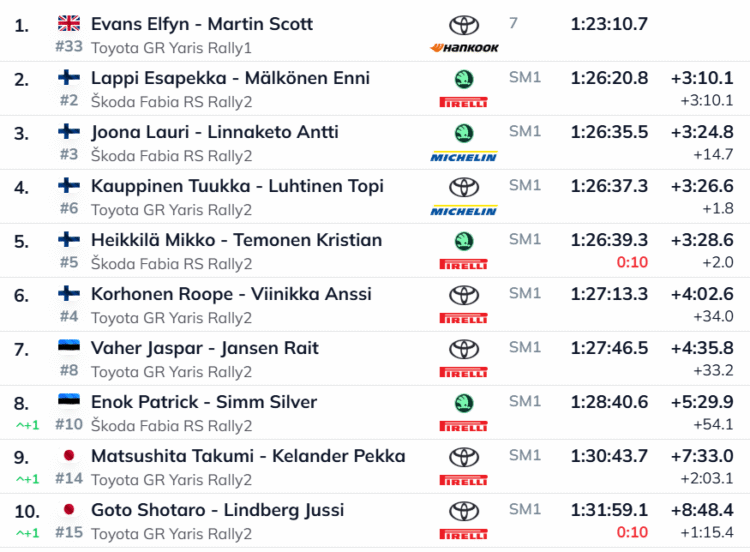 Patrick Enok (Škoda Fabia RS Rally2) kaotas katsel parimale 20,1 sekundit. Grönholmi ebaõnne tõttu tõusis ta üldarvestuses seitsmendale kohale, kuid noormees tunnistas, et ei saanud autot sel katsel päris nii liikuma nagu soovinuks.