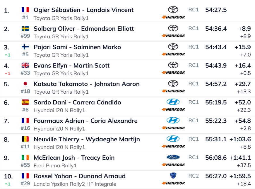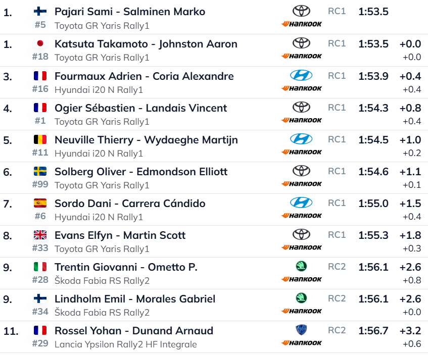 Katsevõitu jäid jagama Takamoto Katsuta ja Sami Pajari. See tulemus tõstis Pajari üldarvestuses Elfyn Evansist 0,5 sekundiga mööda kolmandale kohale. Evans ei jäänud päevaga rahule: “Ei ole üliõnnelik, tahtsime päevast rohkem, aga Oliver ja Seb on selgelt kiiremad olnud. Peame pingutama ja proovima neile homme lähemale jõuda.”