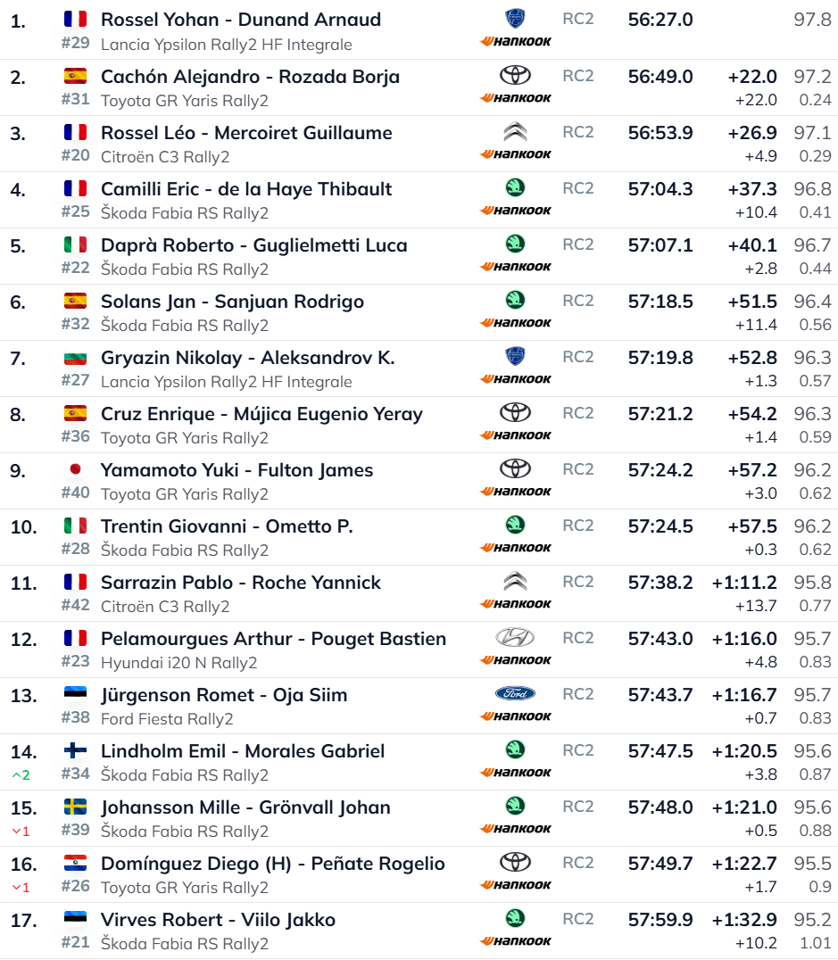 Reedese päeva lõpuks hoiab Jürgenson Rally2 klassi üldarvestuses 12. kohta (+1.16,7 Y. Rosselile) ja Virves on 16. positsioonil (+1.32,9).
