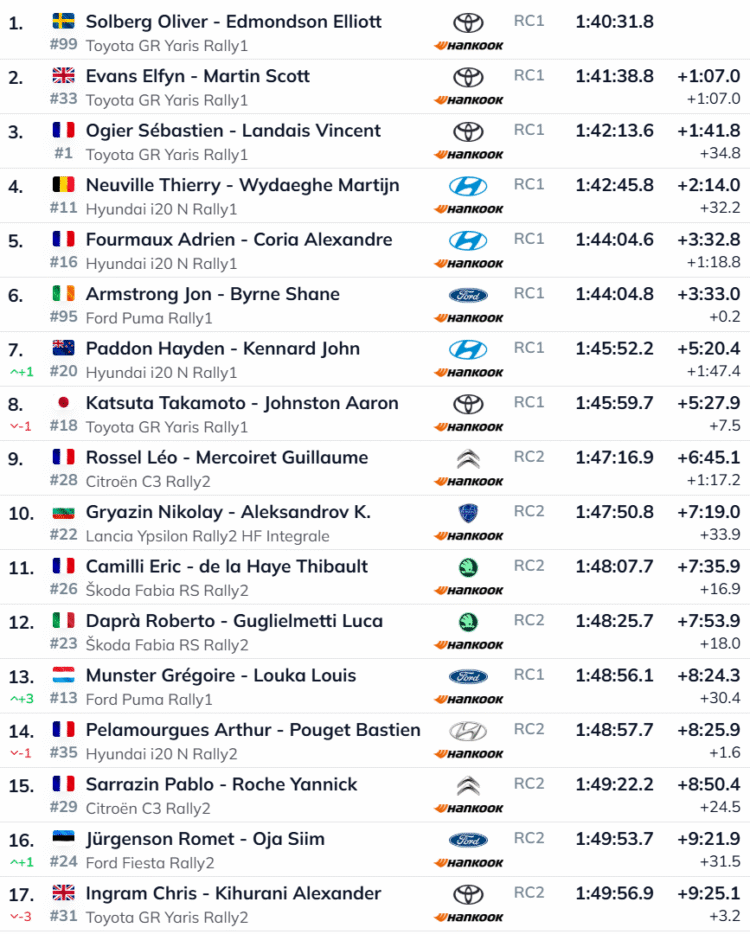 Juba enne seitsmendat kiiruskatset enam kui minutilist edu hoidnud Oliver Solberg (Toyota) ei näidanud raugemise märke ka pärast hoolduspausi. Ta võttis oma neljanda katsevõidu, edestades Sébastien Ogier’d 1,9 ja Elfyn Evansit 2,8 sekundiga. Solbergi üldedu Evansi ees on nüüdseks kasvanud 1 minuti ja 7 sekundi peale.