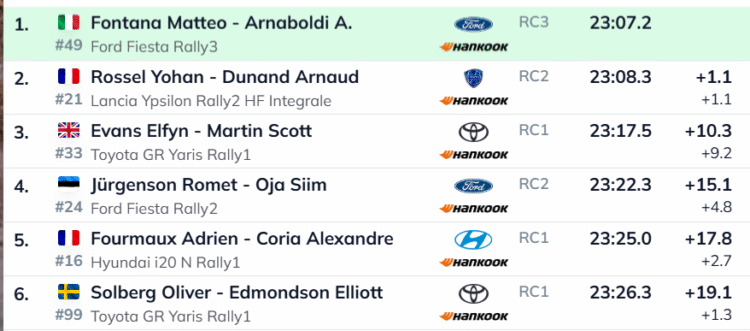 Lõpuks osutus siiski taas kiireimaks Rally3 Fordiga võistlev Matteo Fontana, kes edestas Rosseli 1,1 sekundiga.