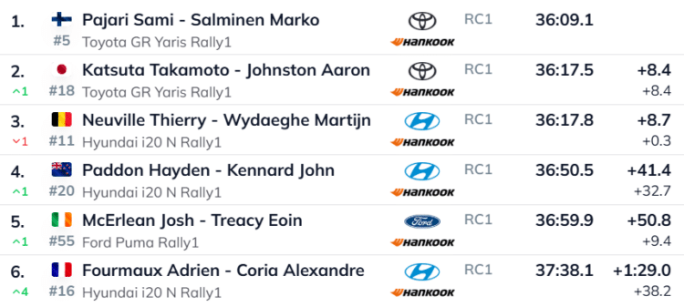Kolmanda aja saanud Adrien Fourmaux väljendas finišis kergendust, et jõudis ringi lõpuni ilma varurehvideta. “Ausalt öeldes on mul hea meel, et see ring läbi sai, sest meil polnud enam ühtegi varuratast. Pidin tempot kontrollima ja rehvipurunemisega mitte riskima. Sõit oli puhas ja tõhus ning see näib toimivat,” märkis Hyundai piloot.