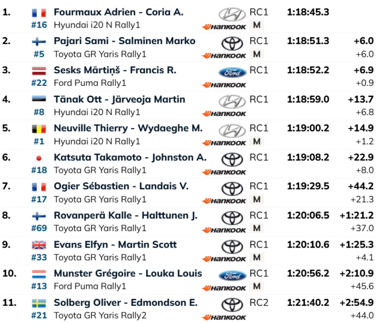 Ott Tänak hoiab ralli üldarvestuses neljandat kohta. Eestlase selja taga on kohe tiimikaaslane Thierry Neuville, kes jääb maha vaid 1,2 sekundiga. Hyundai duo kaotab esikohale vähem kui 15 sekundiga. Kuuendal kohal olev Takamoto Katsuta (Toyota) jääb liidrist maha 22,9 sekundit.