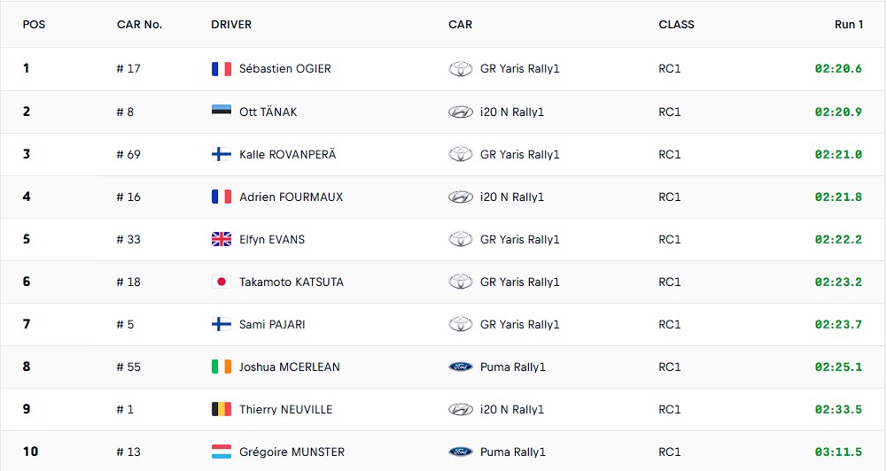 Testikatse esimesel läbimisel tegi Neuville väikese sõiduvea – belglane lõhkus veidi auto tagaosa ning kaotas finišis Ogier’le 12,9 sekundit.
