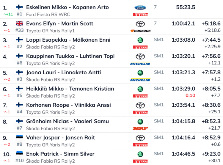 Klassi üldliidrina jätkab Esapekka Lappi, kuid tema edu on kahanenud. Hommikuse kiireima aja sõitis Mikko Heikkilä, kes hoolimata valestardi eest saadud 10-sekundilisest karistusest oli klassi selgelt kiireim mees. Lappi kaotas Heikkiläle 8,2 sekundit ja kurtis suurte teede kiilasjää üle, kus rehv ei leidnud piisavalt pidamist.