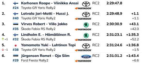 Enne viimast katset lahutas kahte soomlast vaid 1,2 sekundit, kuid otsustaval katsel suutis Korhonen oma liidrikohta säilitada ja lõpetas ralli 1,1-sekundilise eduga kaasmaalase ees.