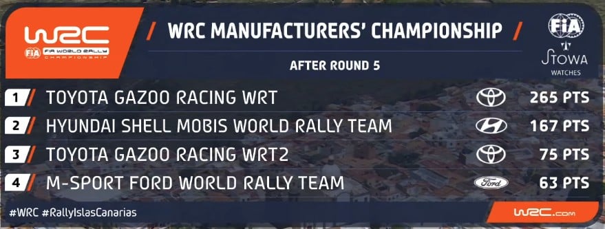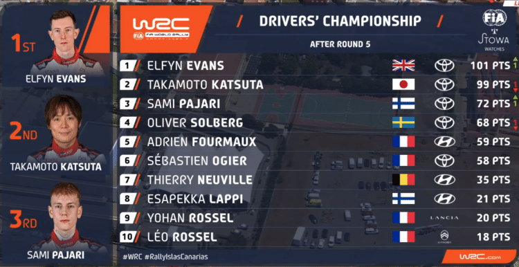 Kanaari saarte MM-ralli sündmused muutsid autoralli MM-sarja üldtabelit. Kuigi ralli üldvõidu võttis Sebastien Ogier, kogus Elfyn Evans viimasest päevast maksimumpunktid, mis tõstis waleslase Takamoto Katsutast mööda MM-sarja uueks liidriks. Kahe Toyota sõitja vahe on viie etapi järel vaid kaks punkti.