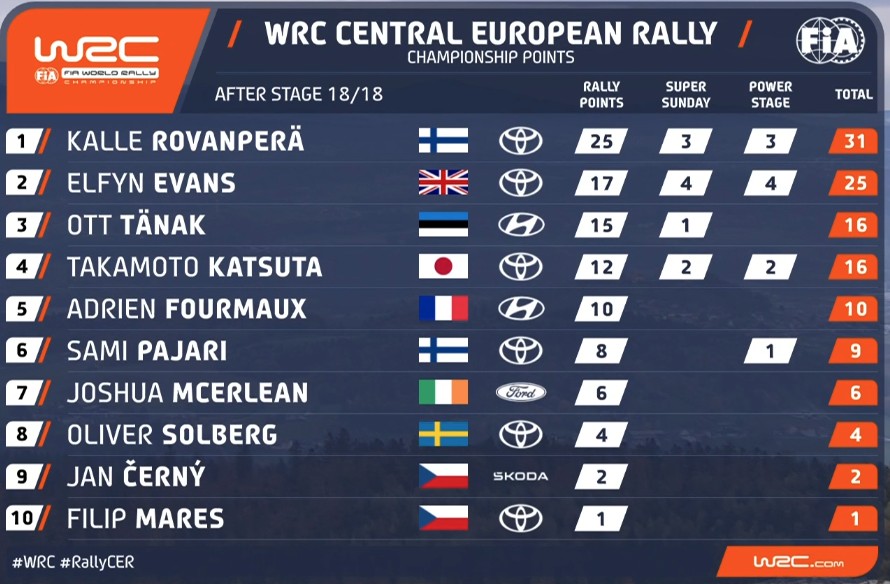 Kesk-Euroopa MM-ralli järel kerkis MM-sarja liidriks Elfyn Evans, kellel on nüüd koos 247 punkti. Ott Tänak püsib 197 punktiga neljandal kohal.