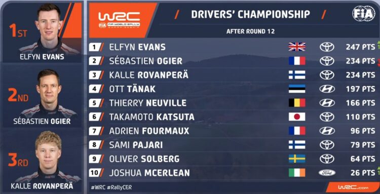 Evans lõpetas ralli teisena ja kogus selle eest 25 punkti, mis võimaldas tal mööduda Ogier’st, kes katkestas laupäeval avarii tõttu. Hooaja vältel on Evans näidanud eelkõige stabiilsust – ehkki tal on kiiruskatsete võitude arvestuses alles viies tulemus (18 katsevõitu), on just järjepidevus viinud ta sarja tippu. Võrdluseks: Rovanperäl on tänavu 50, Tänakul 49, Ogier’l 47 ja Adrien Fourmaux’l 19 katsevõitu.