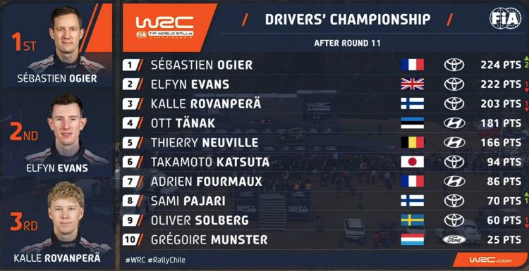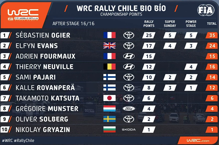 Etapi suurimaks võitjaks kerkis Sébastien Ogier, kes lahkus Tšiilist maksimumi – 35 punktiga – ja tõusis sellega ka MM-sarja liidriks.