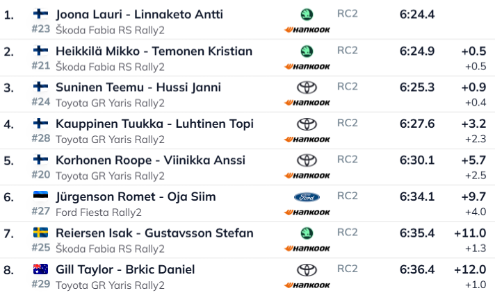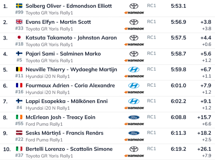 Konkurentide leeris oli parimana viies Thierry Neuville, kes kaotas Solbergile 6,7 sekundit. Talle järgnesid tiimikaaslased Adrien Fourmaux (+7,9s võitjale) ja Esapekka Lappi (+9,1s). Hyundai kolmik püsis seega üksteisele üsna lähedal.