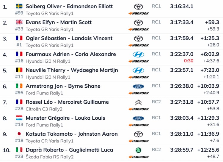 Üldarvestuses kindlalt juhtiv Oliver Solberg võttis viimasel katsel asja kontrollitult ja rahulikult. „Esimene sõõrik oli kohutav, teine juba parem. Ma ei tahtnud pärast nii head nädalavahetust midagi ära rikkuda. Homme on kindlasti ootamas raske päev,“ sõnas rootslane, kes juhib rallit 59,3-sekundilise eduga Elfyn Evansi ees.
