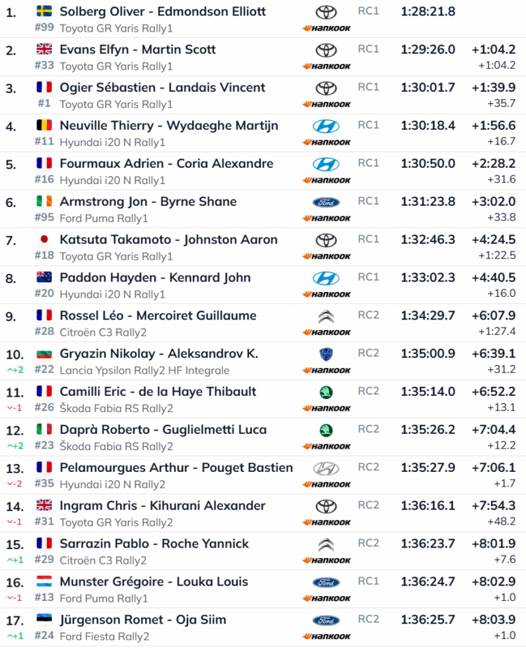 Viiendal katsel rehviprobleemiga aega kaotanud Oliver Solberg (Toyota) ei lasknud end häirida ja vajutas kuuendal katsel põhjaaja, mis jättis konkurendid kaugele. Ta edestas Thierry Neuville’i (Hyundai) 8,8 sekundiga ja oma lähimat jälitajat üldarvestuses, Elfyn Evansit, koguni 20,7 sekundiga.