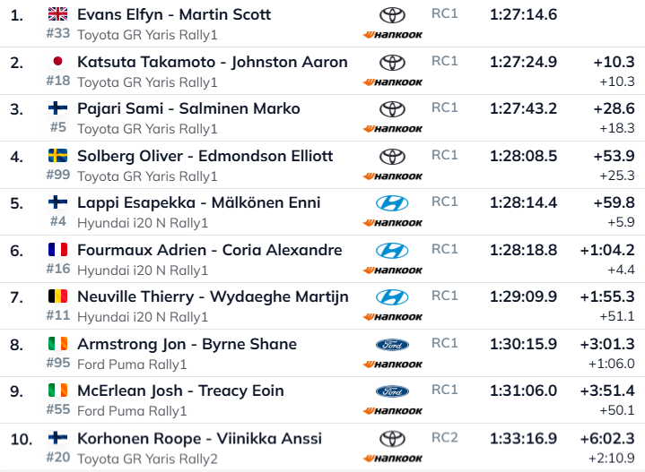 Kolmandal kohal jätkab Sami Pajari, jäädes liidrist maha alla poole minuti. Talle järgnevad Oliver Solberg, Esapekka Lappi ning Adrien Fourmaux. Pajari sõnul oli katse nõudlik: “Midagi erilist ei olnud. Kui siin kurvides veidigi laiaks vajud, kaotad kohe aega. Proovisin natuke rohkem suruda, kuid see ei pruukinud oodatud tulemust tuua.”