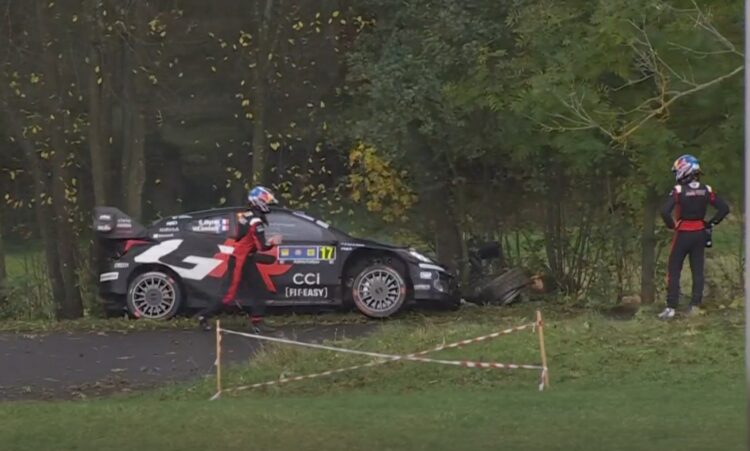 Väga kiires paremkurvis kaldus prantslane veidi rajalt välja ja sõitis otse vastu puud. Masinal tuli alt ka ratas ning sellega sai tema rallipäev läbi.