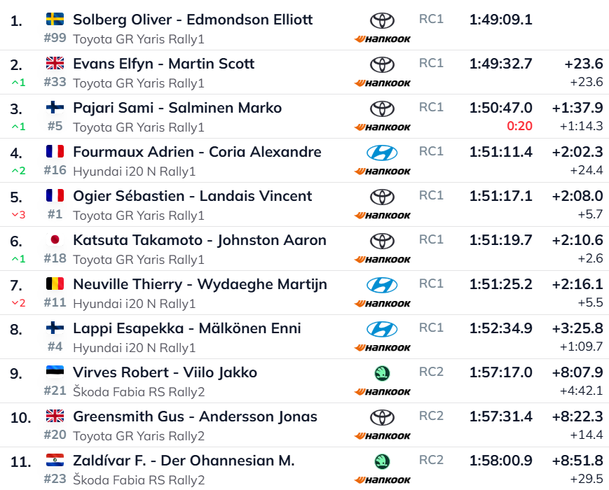 Neljandal positsioonil jätkab head tempot näidanud Hyundai sõitja Adrien Fourmaux, kes kaotab Pajarile 24,4 sekundit. Teda lahutab tagant tulevast Ogierist vaid 5,7 sekundit. Kuuendaks tõusis Toyota piloot Takamoto Katsuta, möödudes Thierry Neuville’ist (Hyundai). Kaheksandal kohal sõitev Esapekka Lappi kaotas katsel Solbergile 32,6 sekundit. Meeskonna korraldusel rakendab ta rahulikku taktikat, eesmärgiga auto rasketes tingimustes turvaliselt finišisse tuua. Laupäeval on kavas sõita veel viis kiiruskatset.
