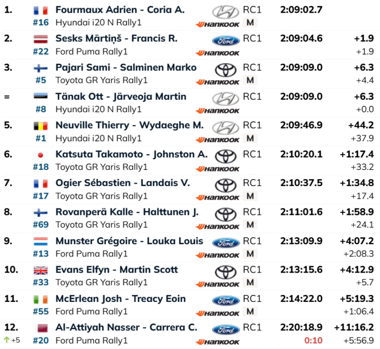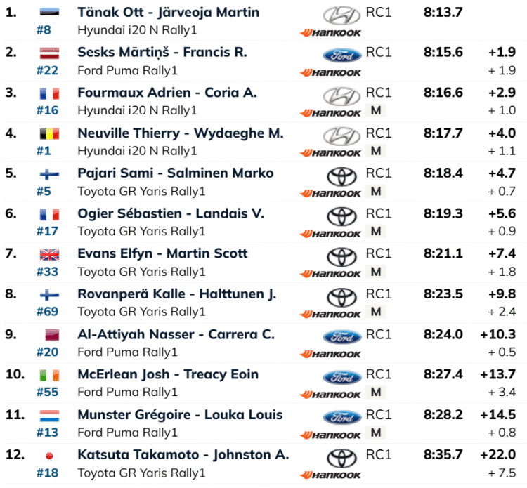 Päeva avakatse kordusläbimisel (SS12) näitasid eestlased taas parimat minekut, võttes sellega oma kolmanda järjestikuse katsevõidu. Selle võimsa spurdiga püüdis Tänak üldarvestuses kinni Sami Pajari – mehed jagavad nüüd kolmandat kohta.