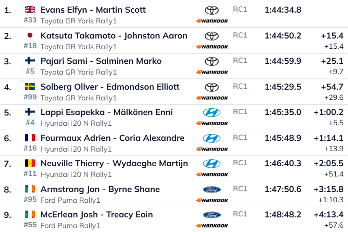 Ralli üldliidrina jätkab Toyota sõitja Elfyn Evans, kelle edu Katsuta ees on 15,4 sekundit. Hoolimata Katsuta muredest hoiab Jaapani autotootja hetkel nelikjuhtimist, kuna Evansile ja Katsutale järgnevad üldtabelis Pajari ning Solberg.