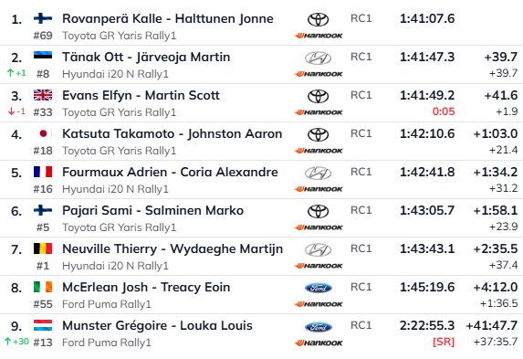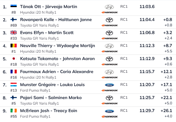 Seni kohal olnud Elfyn Evans kaotas eestlastele 3,2 sekundit, mis tähendab, et Tänak edestab nüüd waleslast 1,9 sekundiga.