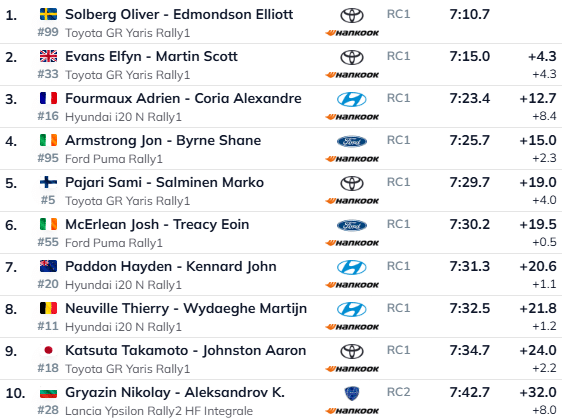 Üldarvestuse esikolmik läbis katse rahulikus tempos. Kolmandat kohta hoidev Sami Pajari kaotas Solbergile 19 sekundit, ralli liider Thierry Neuville 21,8 sekundit ning teisel kohal jätkav Takamoto Katsuta 24 sekundit.