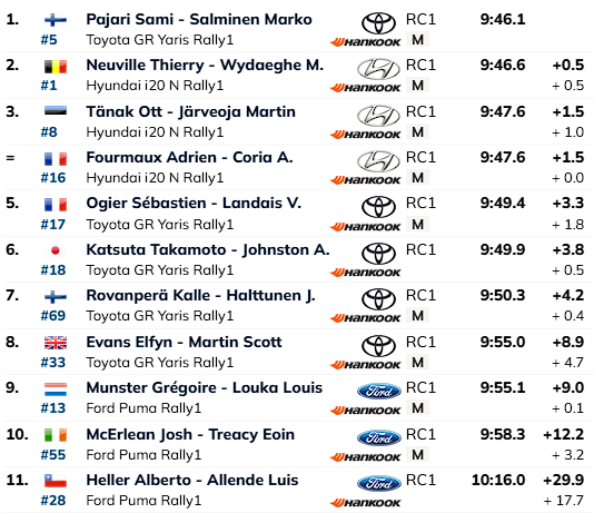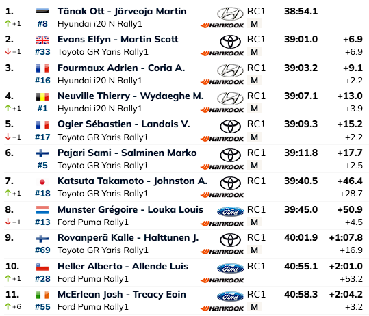 Katse võitjale 1,5 sekundiga kaotanud Tänak edestas senist liidrit, Elfyn Evansit 7,4 sekundiga ning tõusis sellega ka ralli liidriks.