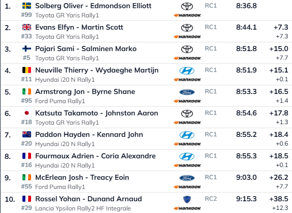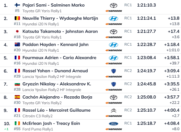 Katse algusosa oli tehniline ning kurvide lõikamisega kandus teele üha enam sodi, mistõttu oli Rally1 masinate rivi lõpus startivatel esikolmiku meestel kõige keerulisem. “Algus oli väga must, teel oli lehti ja muud sodi. Pidamist polnud lihtne hinnata, aga ma ei sõitnud üle piiri ja võin rahul olla,” nentis Neuville, kes suurendas samas vahet kolmandal kohal oleva Takamoto Katsutaga (jaapanlane jääb temast nüüd 3,6 sekundi kaugusele).