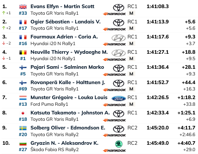 Päeva pikimal katsel oli kõige kiirem Kalle Rovanperä. Soomlasele 7.3 sekundiga kaotanud Evans tõusis aga ralli liidriks.