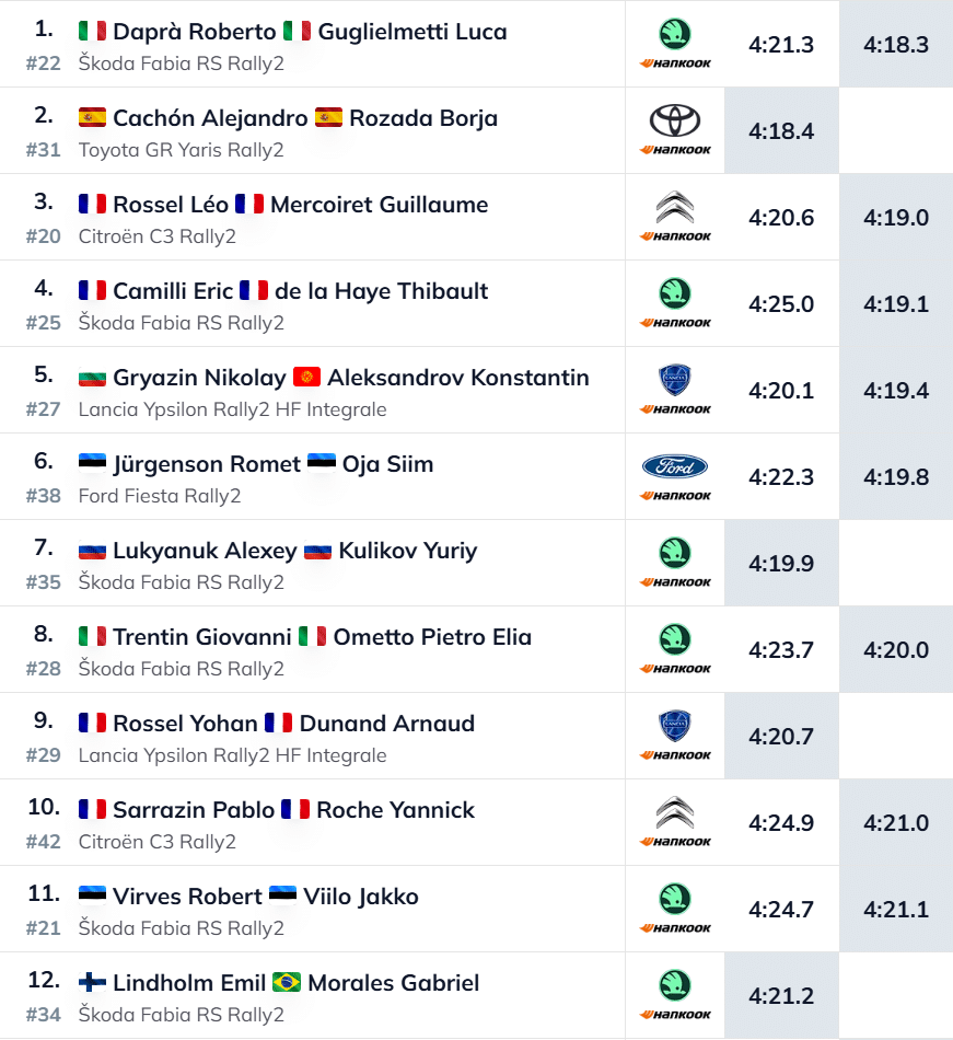 Rally2 autodest sai Romet Jürgenson kirja kuuenda tulemuse, läbides testikatse ajaga 4.19,8. Robert Virves lõpetas testikatse 11. ajaga ning parimat minekut näitas itaallane Roberto Dapra, kes sai ajaks 4.18,3.