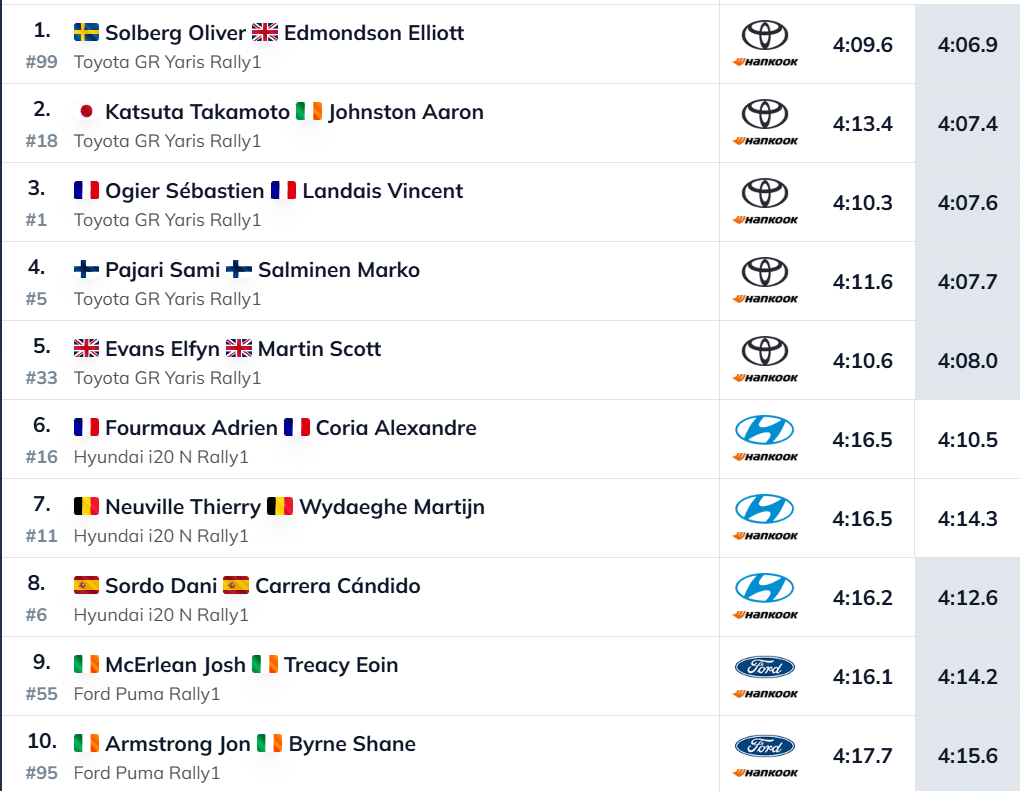 Hyundai tehasetiimi jaoks möödus testikatse tagasihoidlikumalt. Lõuna-Korea meeskonna parimat aega näitas Adrien Fourmaux, kes paigutus kuuendaks. Ta kaotas Solbergile 3,4 sekundit, mis teeb ajakaotuseks ligi pool sekundit kilomeetri kohta.