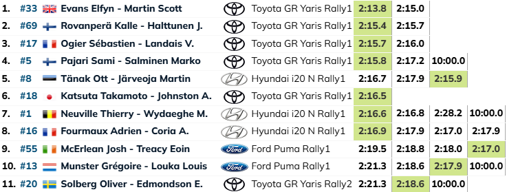 Kiireim oli Elfyn Evans, kellele järgnesid tiimikaaslased Kalle Rovanperä, Sébastien Ogier ja Sami Pajari. Parima Hyundai sõitjana näitas Ott Tänak viiendat aega, kaotades Evansile 2,1 sekundit.