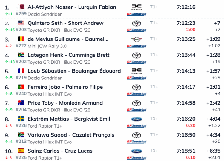 Heitlus on aga haruldaselt tihe – Al-Attiyah ja tänane etapi võitja Quintero on teineteisest lahutatud vaid seitsme sekundiga. Samuti püsib löögiulatuses De Mevius, kes kaotab liidrile pisut üle minuti.
