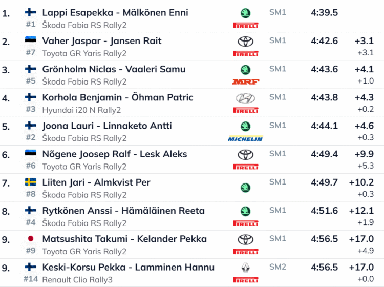Päeva suurima tormihoiatuse andis aga alles 18-aastane Jaspar Vaher, kes kaotas kogenud Lappile vaid 3,1 sekundiga. Vaher, kes kuulub tänavusest hooajast Toyota WRC-tiimi noorteprogrammi, tegi Mikkelis oma debüüdi neliveolise Toyota GR Yaris Rally2 autoga.