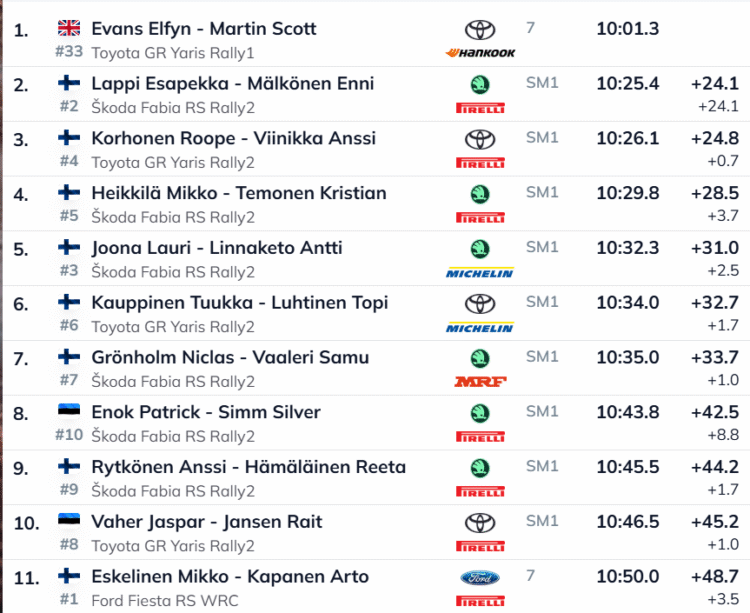 Ralli üldarvestuse liidriks asus oodatult Toyota tehastesõitja Elfyn Evans, kelle edumaa ülejäänud seltskonna ees on mäekõrgune. Waleslase ülekaal tuleneb suuresti tehnilisest eelisest – tema juhitav Rally1-klassi auto on oluliselt võimsam kui Vaheri ja Enoki kasutuses olevad Rally2 masinad. Evans edestas avakatsel Lappit 24,1 sekundiga.