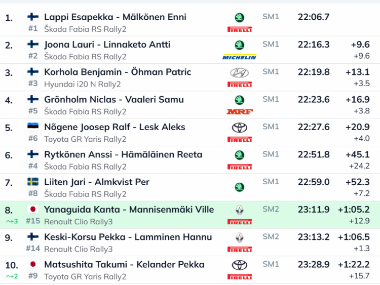 Lappi edu teisel kohal oleva Lauri Joona ees on 9,6 sekundit. Kolmandat kohta hoiab Benjamin Korhola (+13,1) ja neljas on Niclas Grönholm (+16,9). Eestlastest jätkab SM1 klassis Joosep Ralf Nõgene, kes hoiab kolme katse järel tublit viiendat kohta, kaotades liidrile 20,9 sekundit.