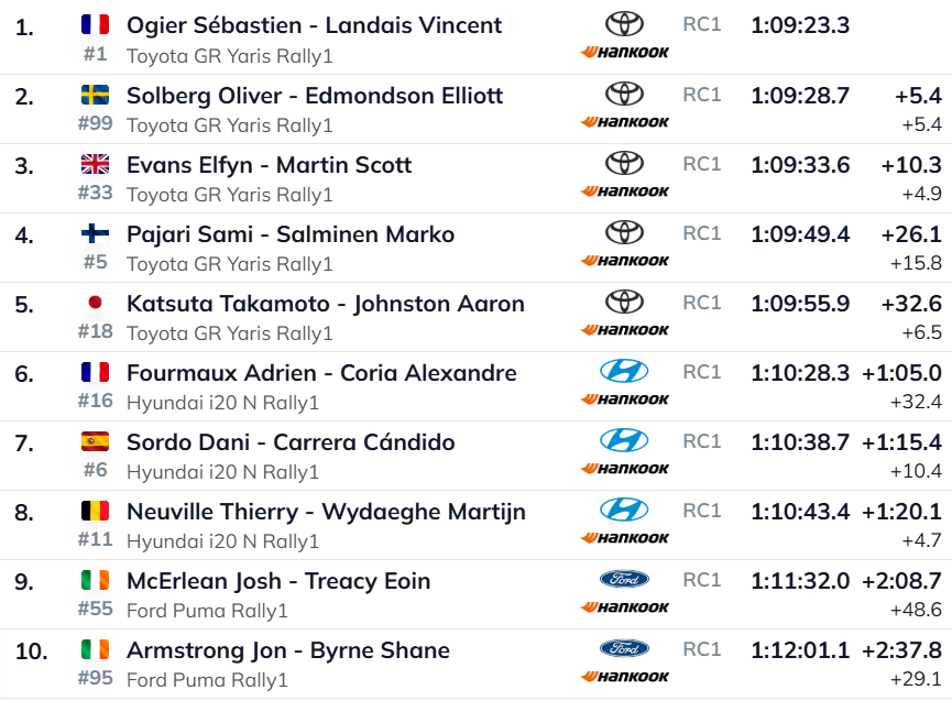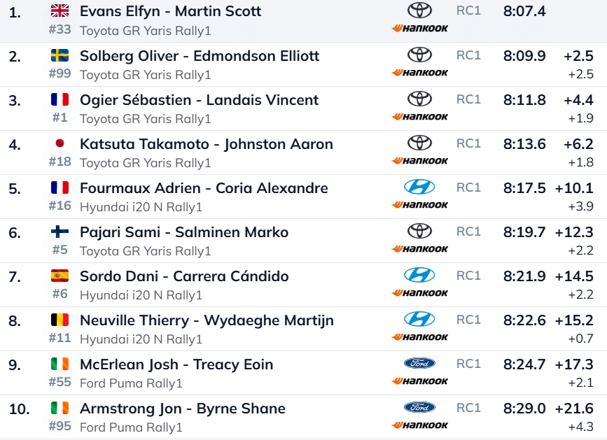 Kümnenda katse järel säilis Toyota vankumatu viisikjuhtimine, kus Ogierile järgnesid Solberg (+7,3), Evans (+14,7), Pajari ja Katsuta. Hyundai siseheitluses kerkis Adrien Fourmaux mööda Dani Sordost kuuendaks, kuid liidrile kaotab prantslane juba terve minutiga.