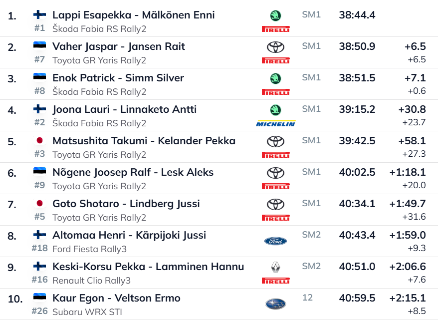 Riihimäe autorallil on enne kaht viimast kiiruskatset kujunenud välja pingeline seis, kus kogenud Esapekka Lappi edu teist ja kolmandat kohta hoidvate Jaspar Vaheri ning Patrick Enoki ees on kahanenud vaid 6,5 sekundile.